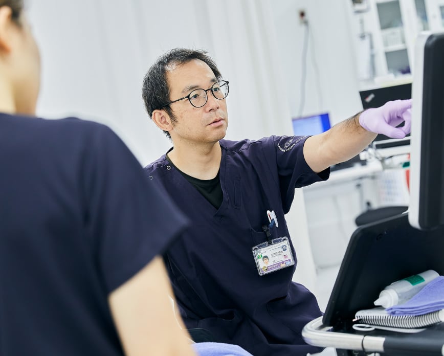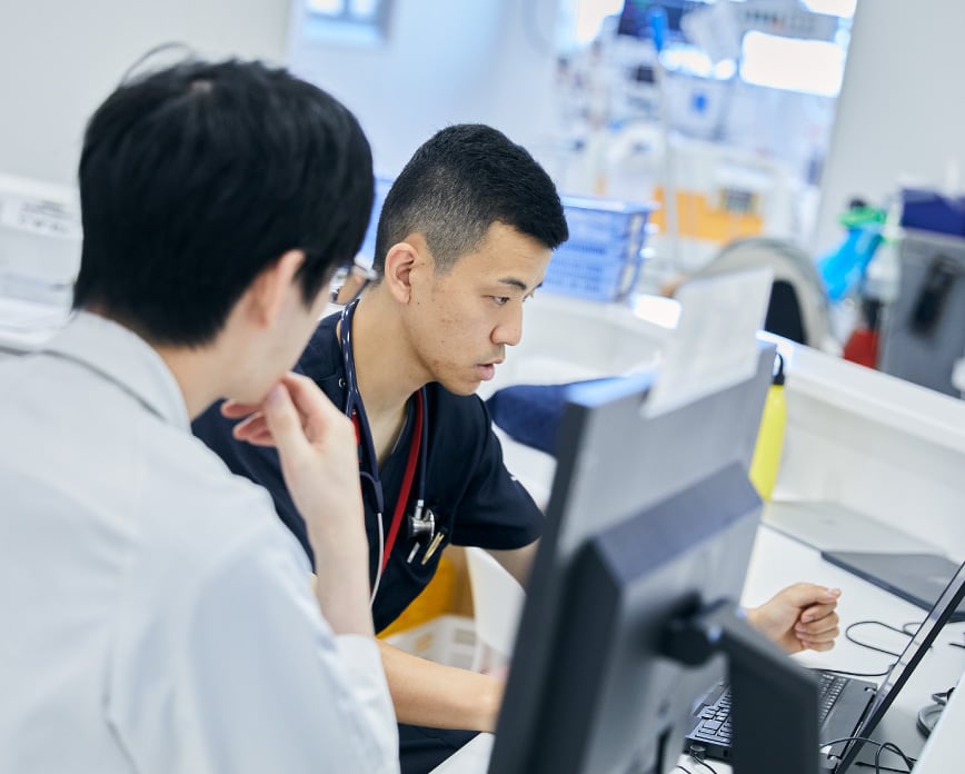 救急科専門医、内科専門医、集中治療専門医が複数在籍しており、同じ時間帯に勤務することで安心安全な環境で充実した指導が受けられます。また、大学病院に比べて規模が小さいため、臓器別専門家の先生とコミュニケーションが取りやすく、お互いに知識を共有し合うことで学びを深めていけます。